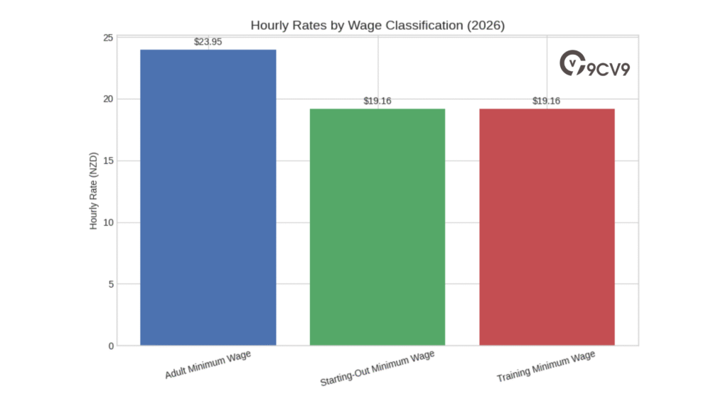 New Zealand’s wage legislation outlines several statutory minimum wage categories based on employment status and training conditions. Each category has its own pay structure and eligibility criteria. The table below presents the updated wage tiers that take effect from April 1, 2026.